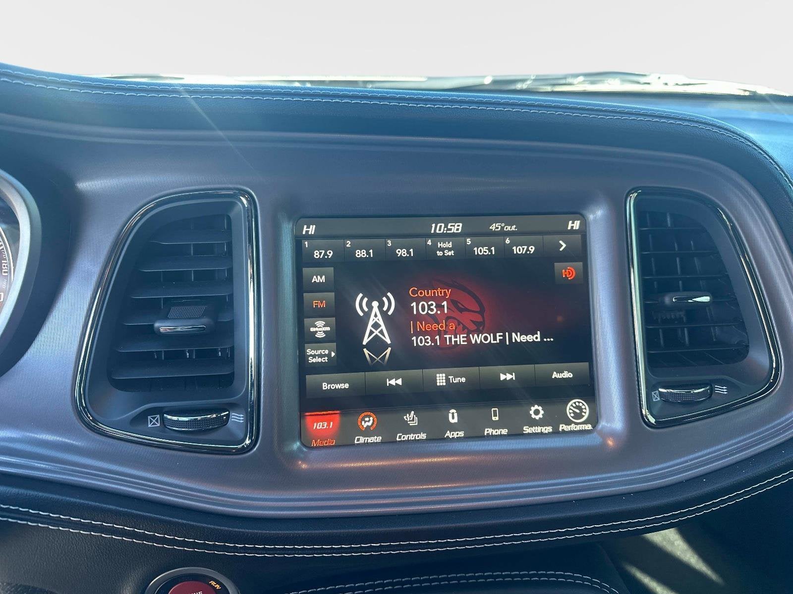 Inside, the cabin blends performance and luxury with ventilated and heated front seats, a heated SRT leather steering wheel with red LED logo, premium-stitched dash, suede door panels, memory seating, and a power tilt/telescope steering column. Technology and convenience are elevated with Uconnect 4C and an 8.4-inch touchscreen, SRT Performance Pages, a 200-mph speedometer, blind-spot monitoring, adaptive cruise control, forward collision warning, rain-sensing wipers, and a Harman Kardon 18-speaker premium audio system. Exterior upgrades include a power sunroof, SRT performance spoiler, black brake calipers, and Midnight Metallic badging that complete its menacing presence.